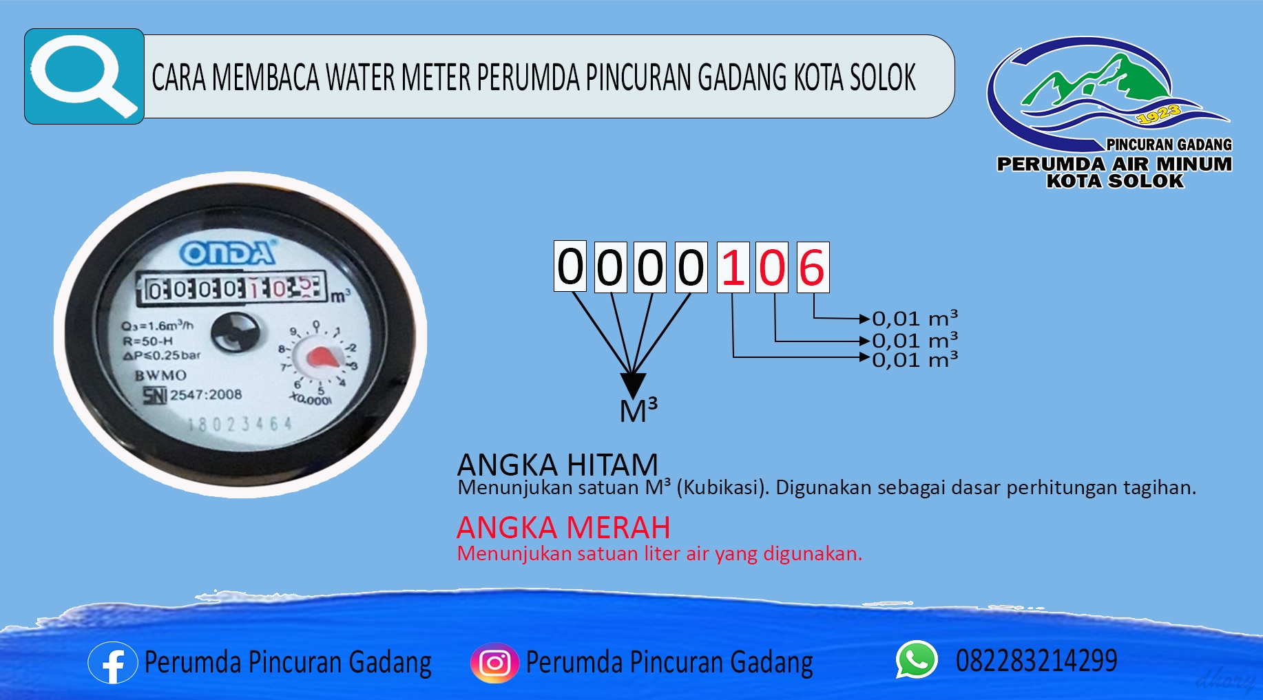 Tahukan Sahabat Air Perumda Pincuran Gadang Cara Membaca Meteran Air ? Pada Meteran Air terdapat beberapa angka yang berwana Hitam dan Merah. Angka Warna Hitam menunjukan Kubikasi Pemakaian air, yang digunakan sebagai perhitungan tagihan setiap bulannya. Angka warna merah menunjukan Liter