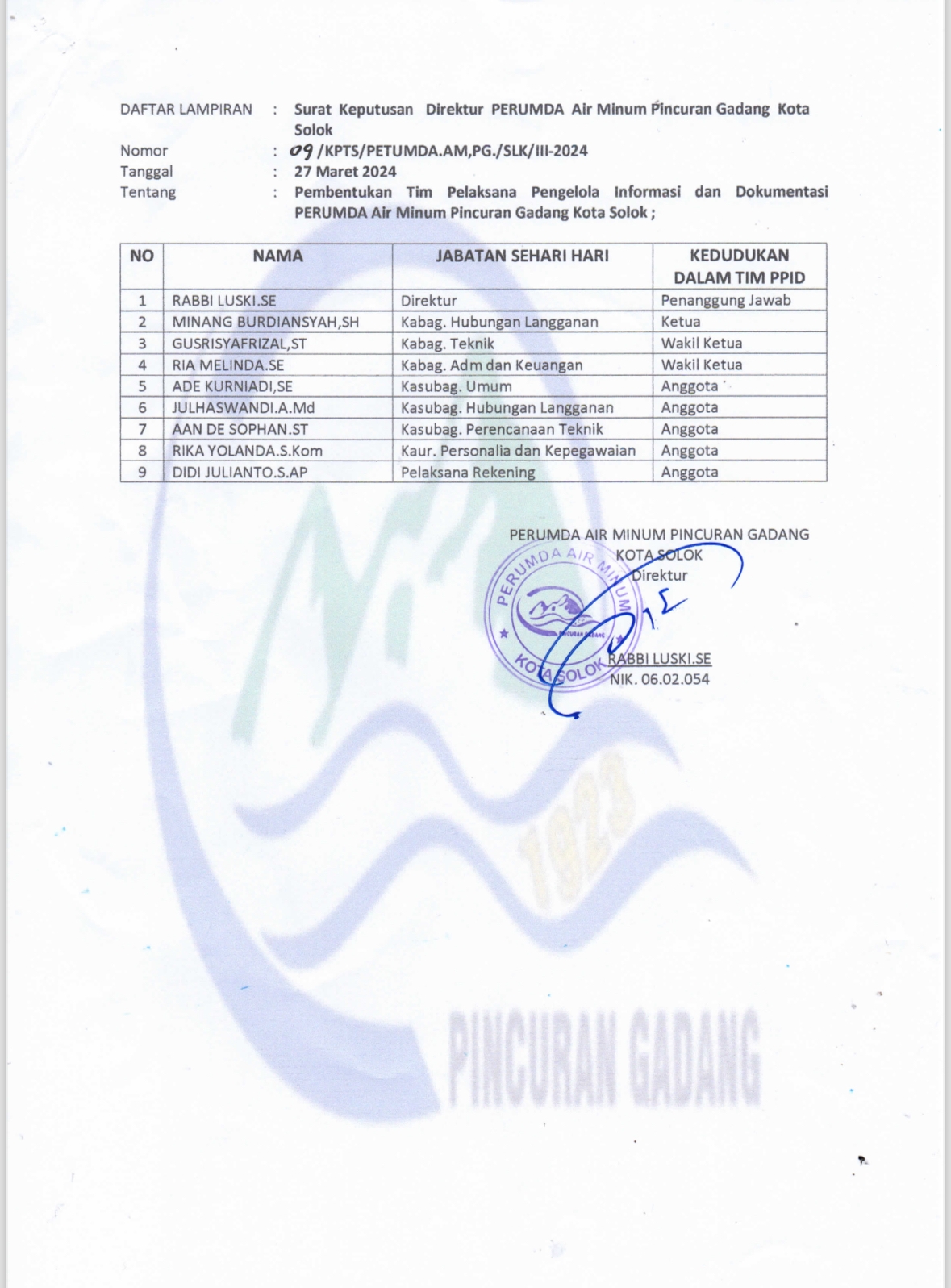 Struktur PPID Perumda Air Minum Pincuran Gadang