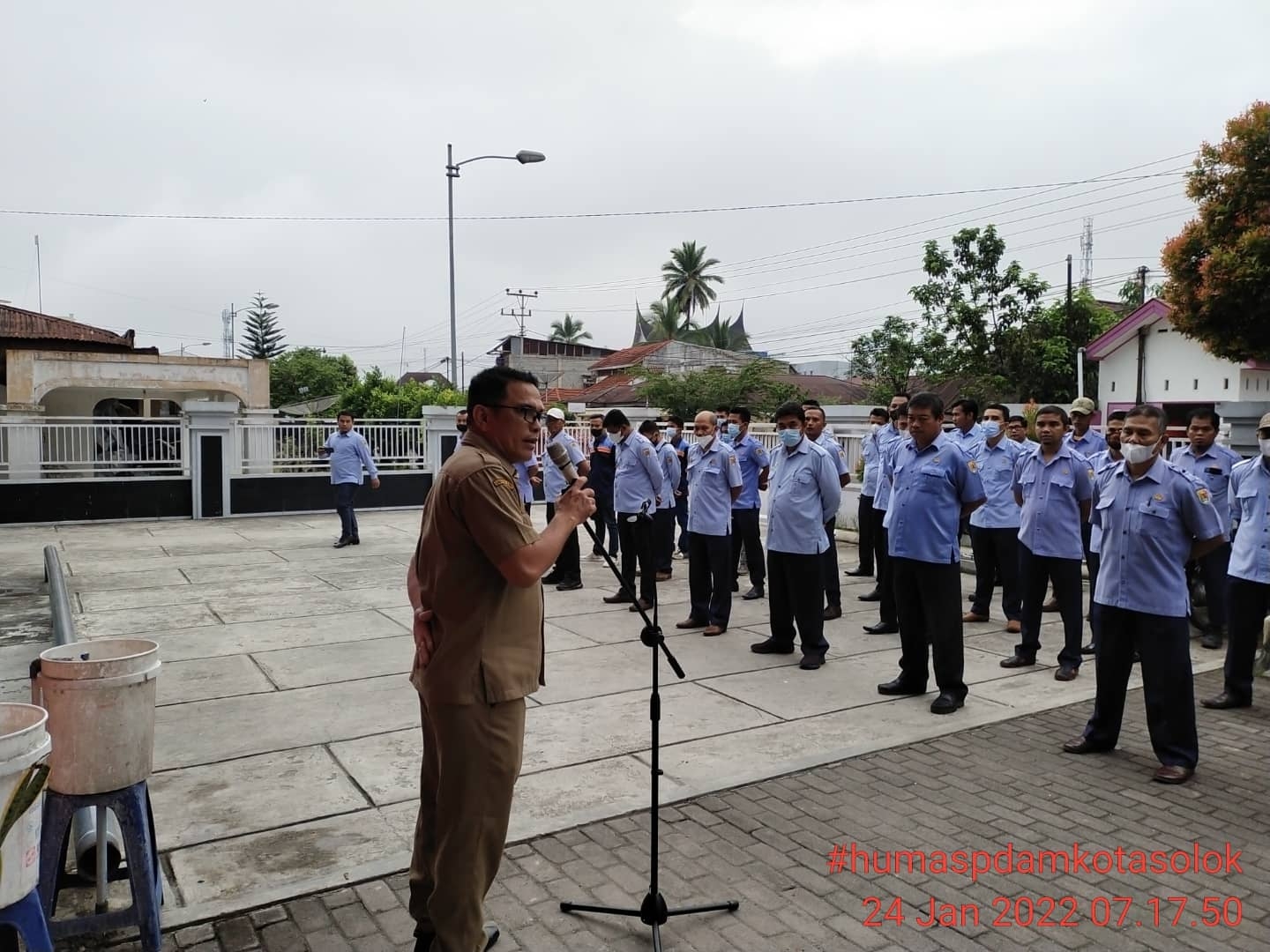 Bismillah Apel pagi PDAM Kota Solok.  Senin, 24 Januari 2022. Pembina Apel Dewan Pengawas PDAM Kota Solok Bapak Jeprizal. SPt. MT Dan juga di hadiri Seketaris Dewan Pengawas Ibuk Milda Nurniati, Spd.